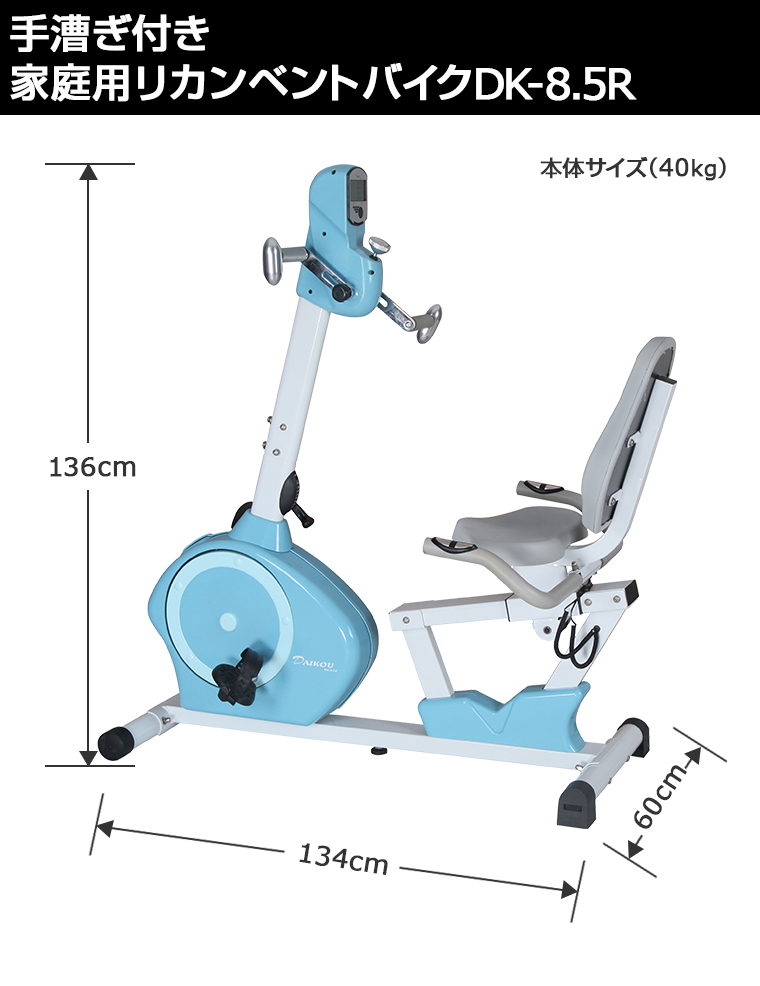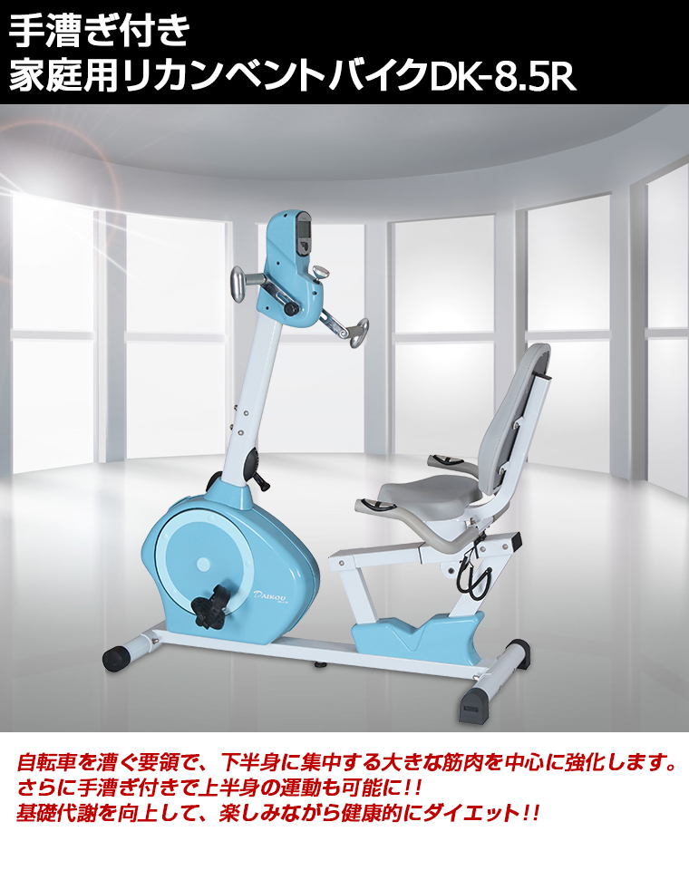 DK-8.5Rは、ダイコー社が開発する家庭用手漕ぎ付リカンベントバイクの最新モデルです。背もたれに寄りかかりながら、手足同時運動!無理がなく、リハビリ、健康促進に最適です。