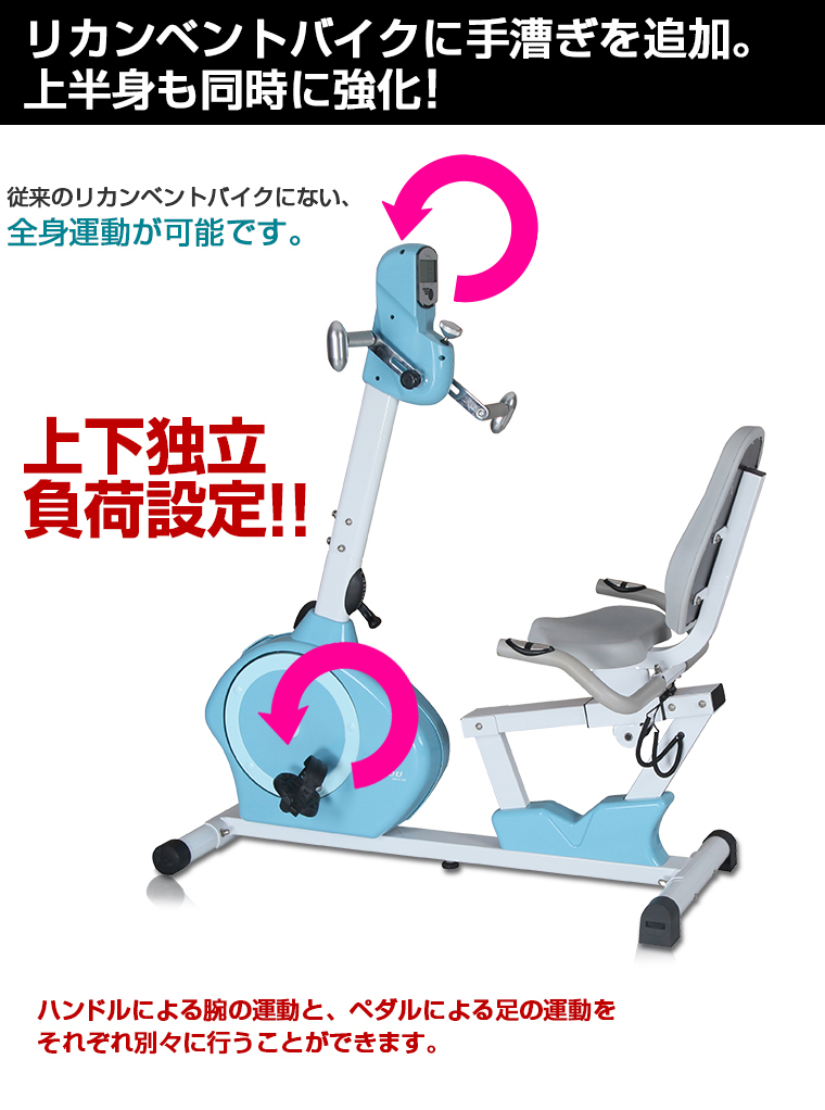 手足同時運動ができる手漕ぎ付きリカンベントバイクです。
