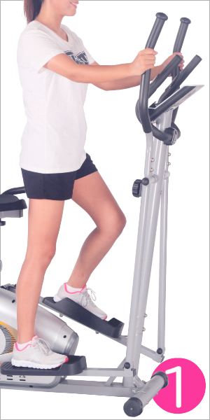 ①立った状態でトレーニング。手足が連動して、クロスカントリースキーのような動作で効率の良い全身運動が可能。手足の関節の可動に加え、腰のひねりも加わるので、全身のシェイプアップに効果的です。