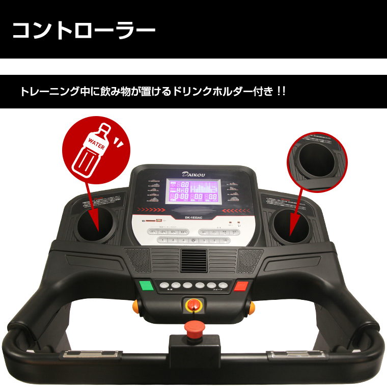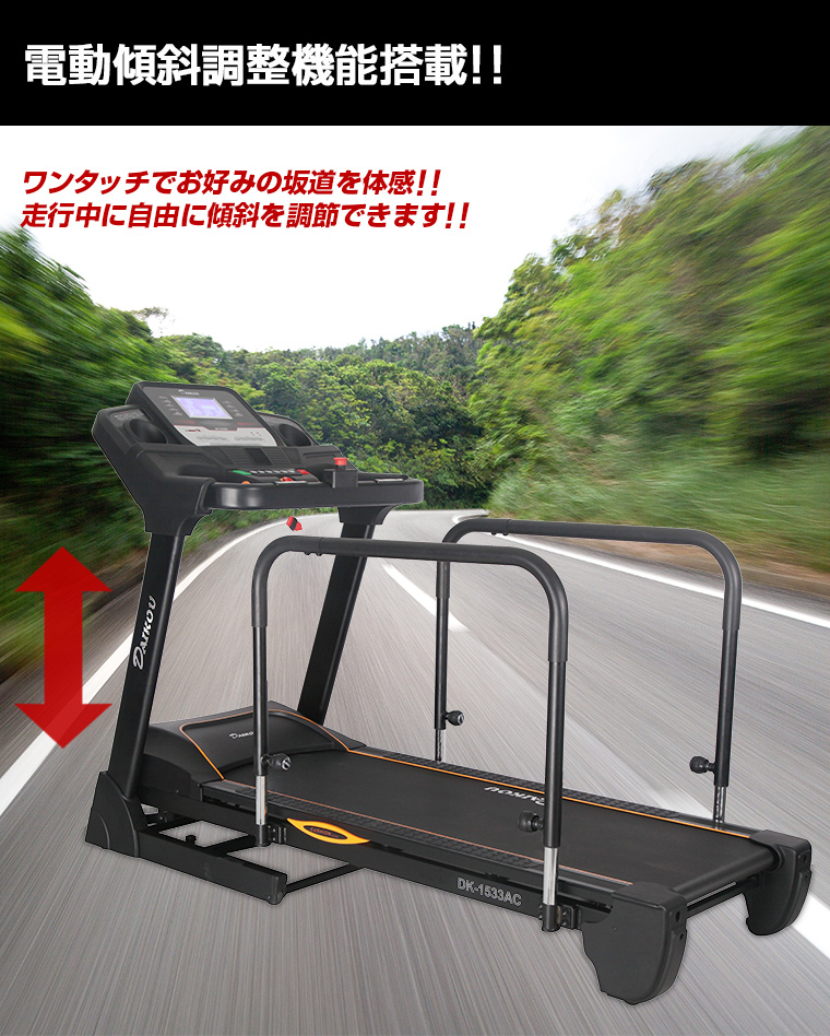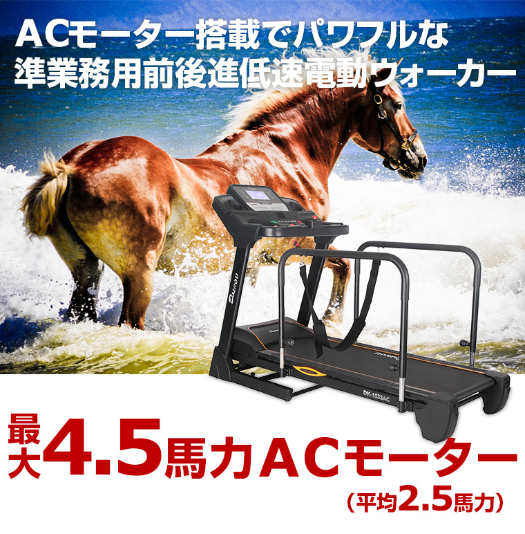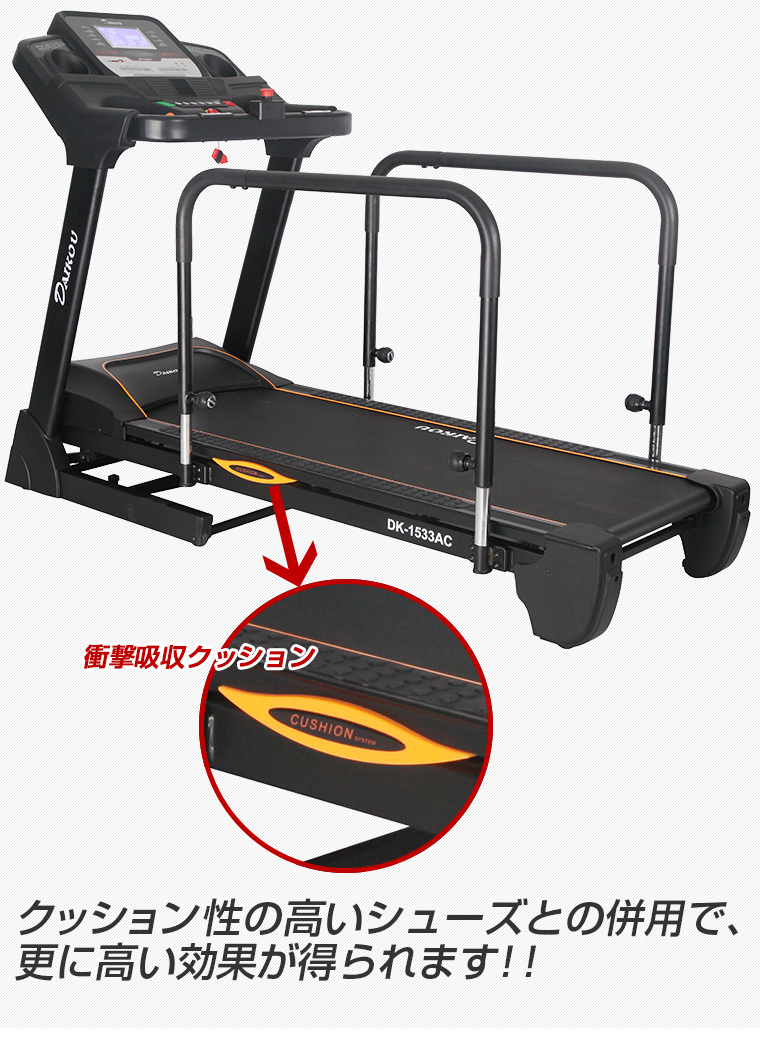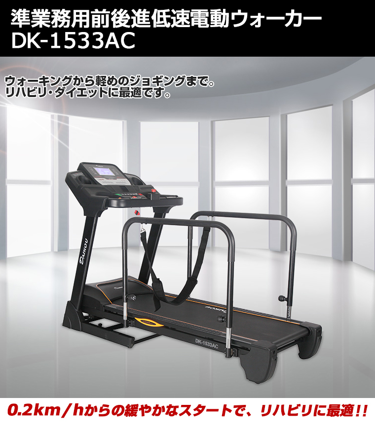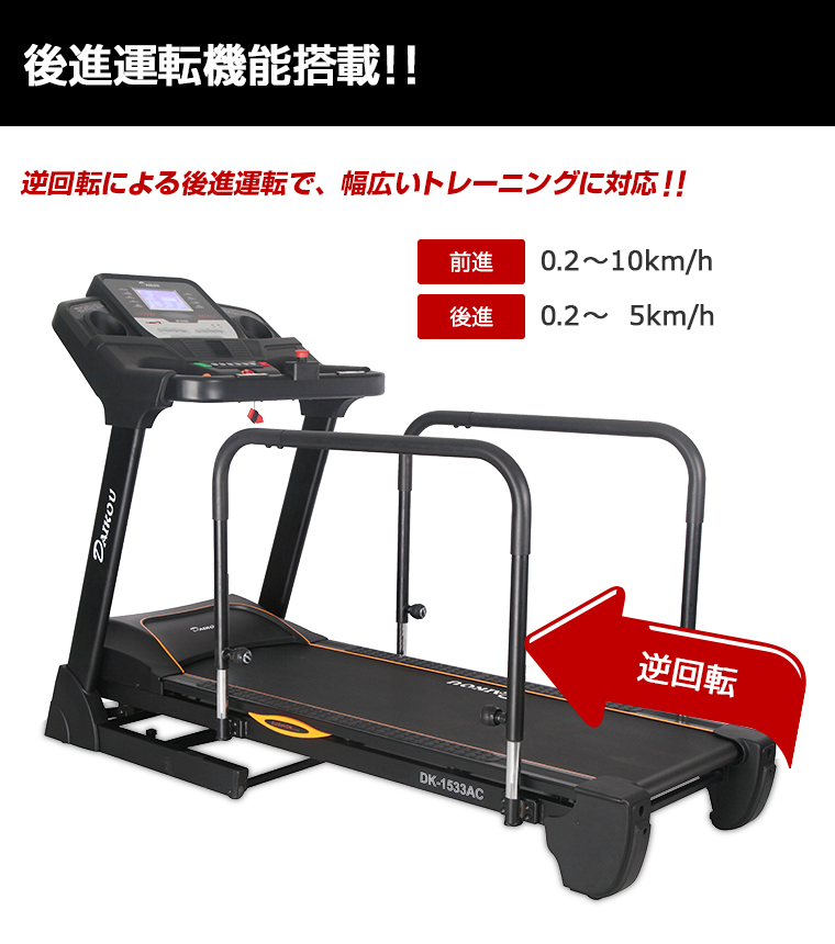 DK-1533ACは、ACモーターを搭載した準業務用のランニングマシンです。逆回転による後進運転で、幅広いトレーニングに対応します。