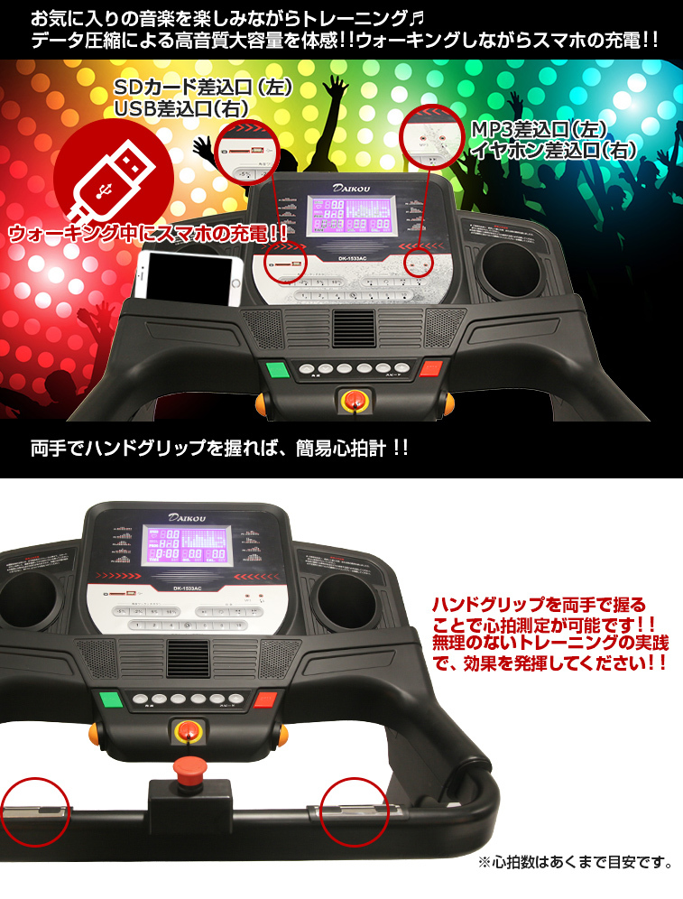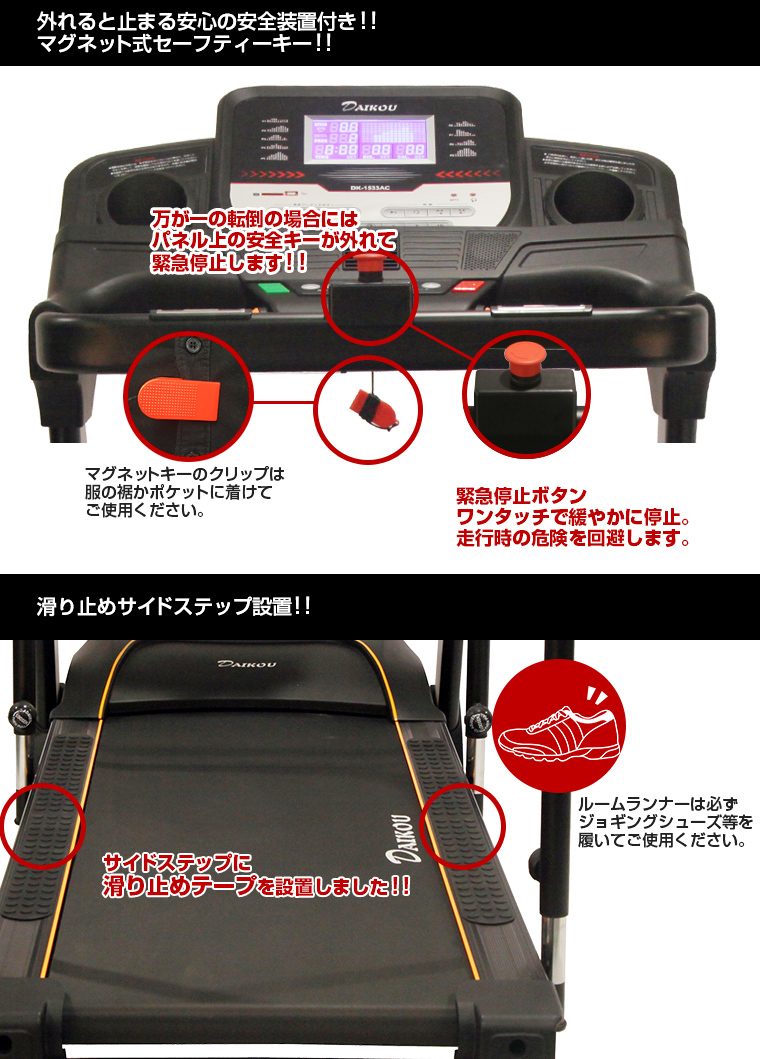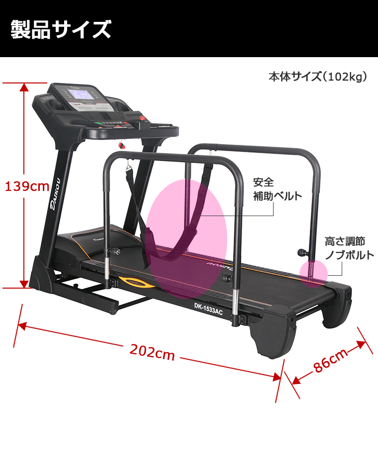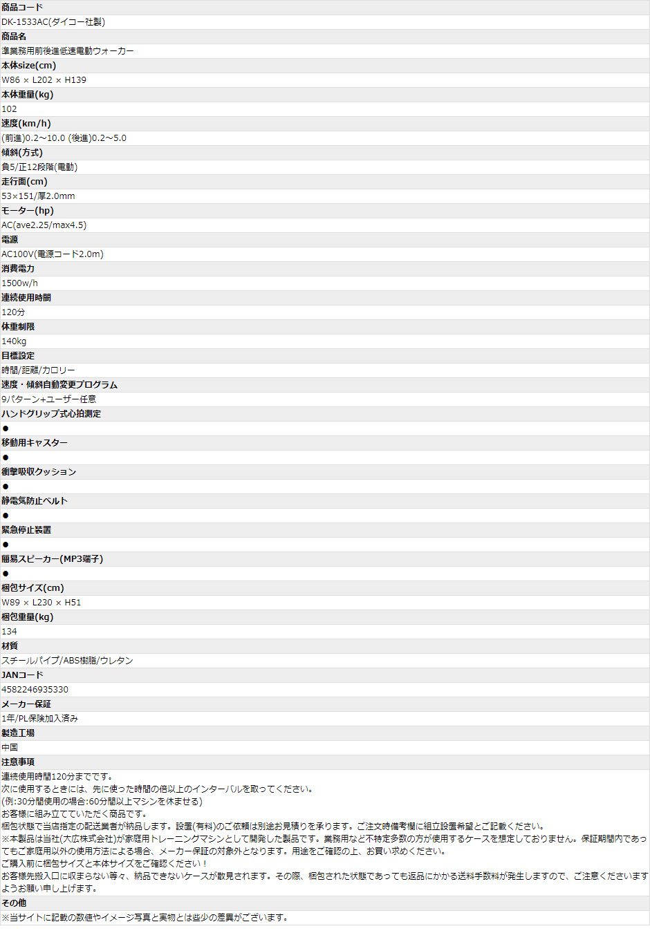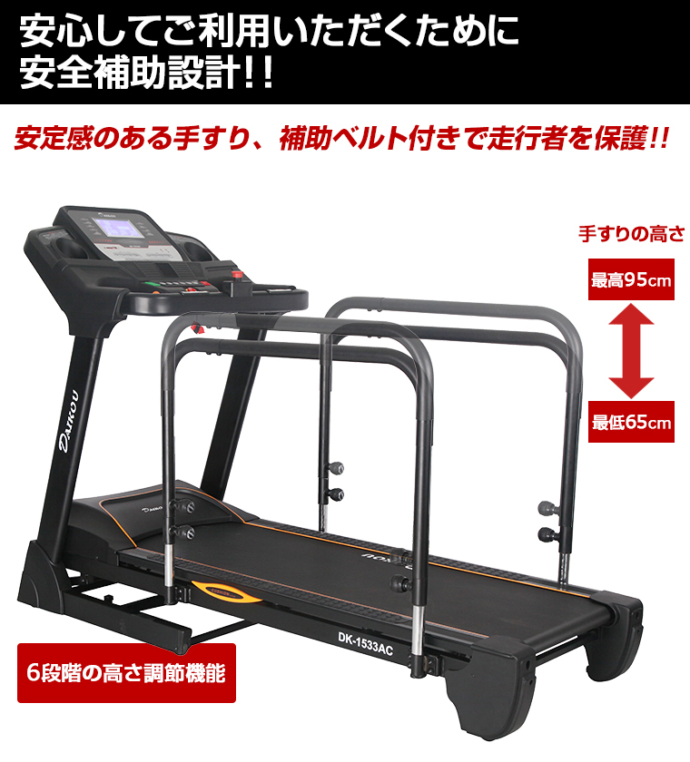 DK-1533ACは、ACモーターを搭載した準業務用のランニングマシンです。逆回転による後進運転で、幅広いトレーニングに対応します。
