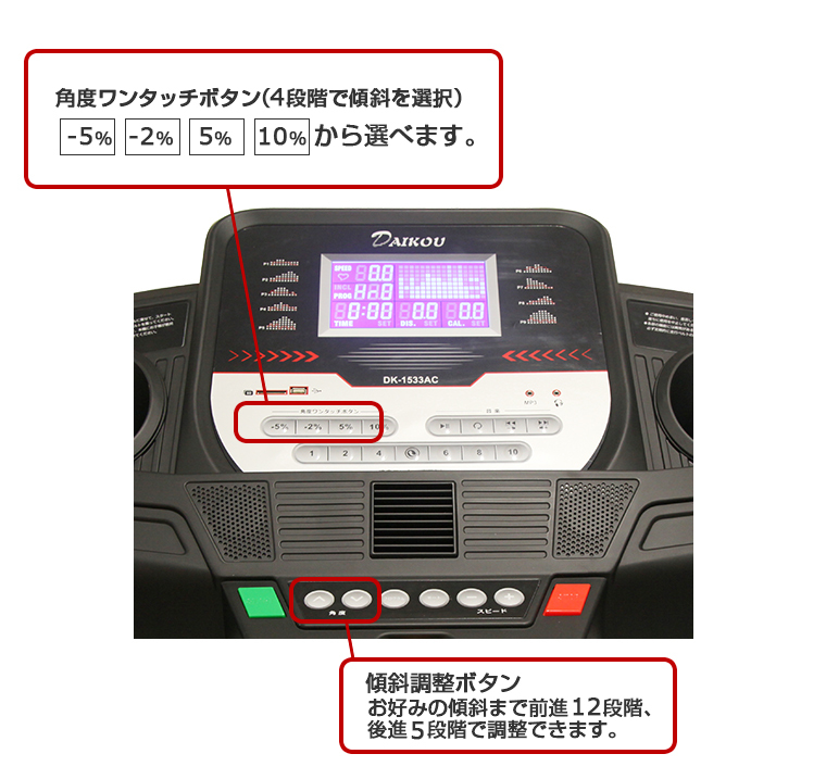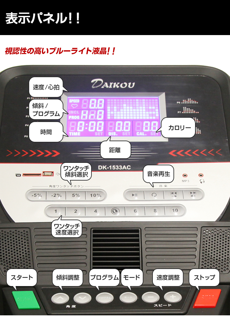 準業務用ランニングマシンDK-152ACは、使いやすさにこだわった大型パネルです。感覚的な操作でもトラブルなくトレーニングを誘導します。