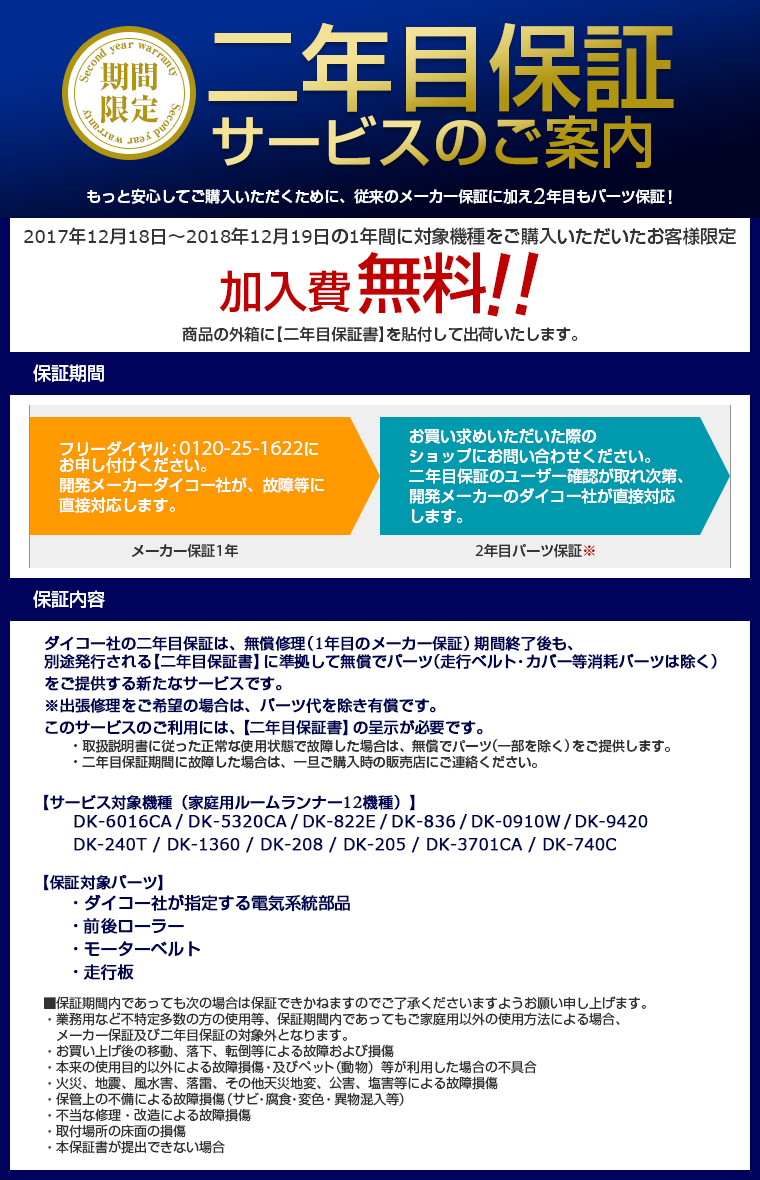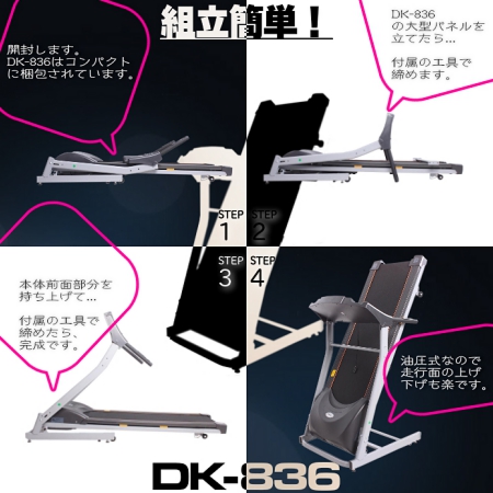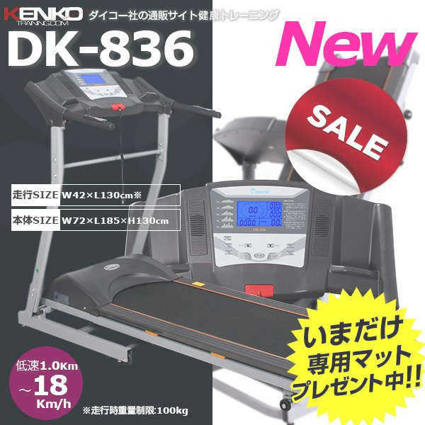 ルームランナーDK-836(ダイコー社製)は2.5馬力のハイパワーマシン。1.0km/h~最高速度18km/h可能な家庭用ルームランナーです。ウォーキングからジョギング更に本格的なランニングまで幅広いトレーニングが可能です。この価格でこのスピードは業界初です。![]()