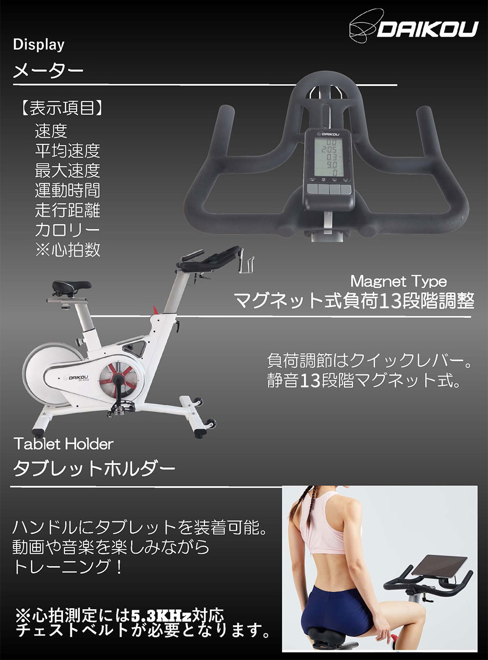 静音マグネット負荷式フィットネスバイク。純アルミニム素材のホイールに依り、本体重量37kgの軽量さと最大負荷403Wのペダルの重さを両立。
