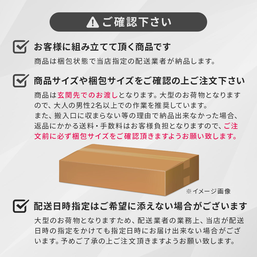 通路が通れない・階段が上がらない・入口が通らない等搬入経路の確認不足による搬入不可の場合は搬入が出来なかった場合もご返金はお受け出来ませんので、必ず梱包サイズ・梱包重量をご確認頂き、搬入経路(障害物を含む通路の幅・曲がり角・階段の天井の高さ・階段の切り返し等)をしっかりご確認下さい。