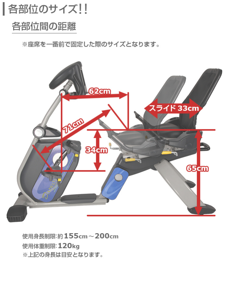 | 本体サイズ(cm) | シート可動域 | 連続使用時間 | 適応身長 | パネル表示 |