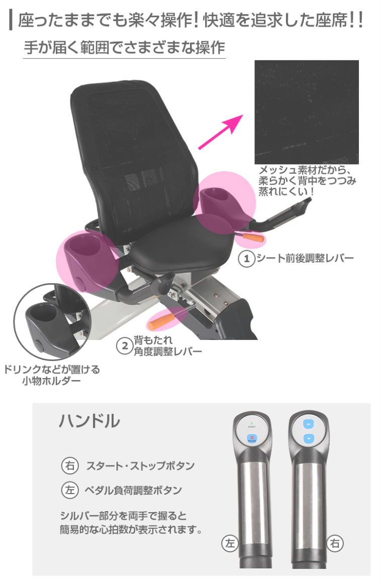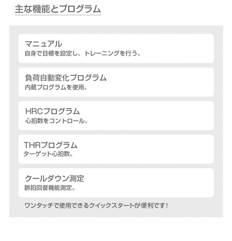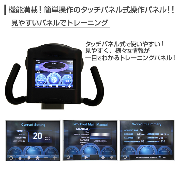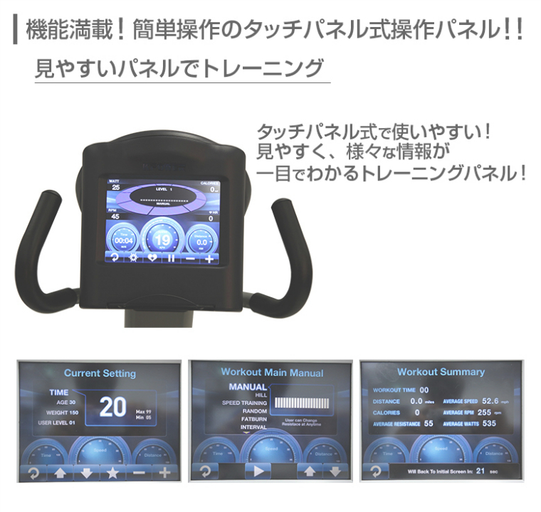 | スチールパイプ/ABS樹脂/ウレタン | - | カラー液晶タッチパネル | スタート/ストップ/負荷 | 自動負荷変化*10 |
