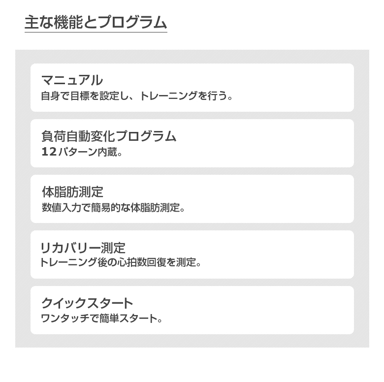 | スチールパイプ/ABS樹脂/ウレタン | - | カラー液晶タッチパネル | スタート/ストップ/負荷 | 自動負荷変化*6 |