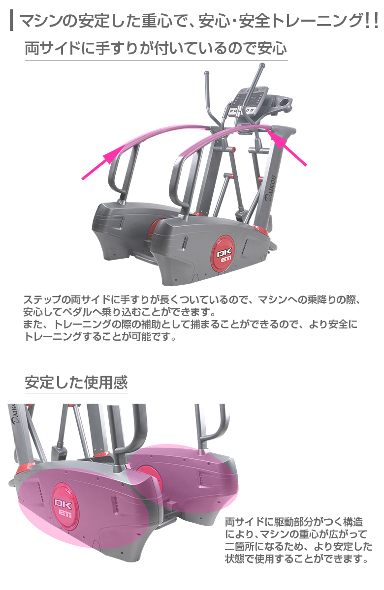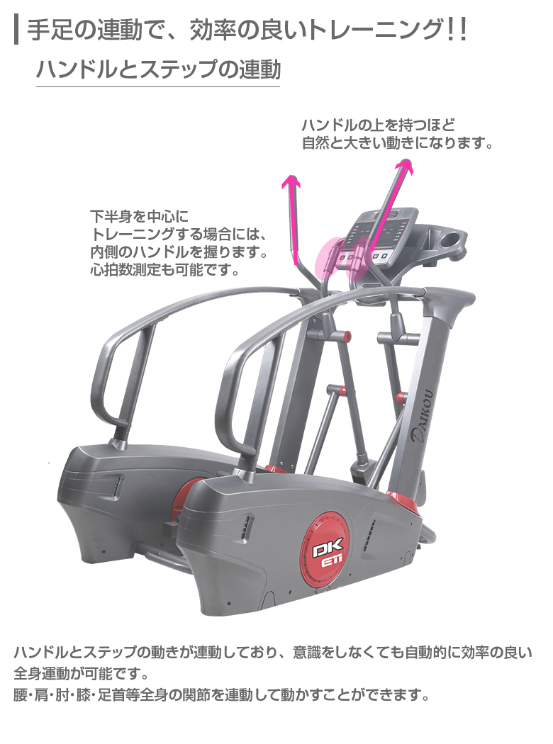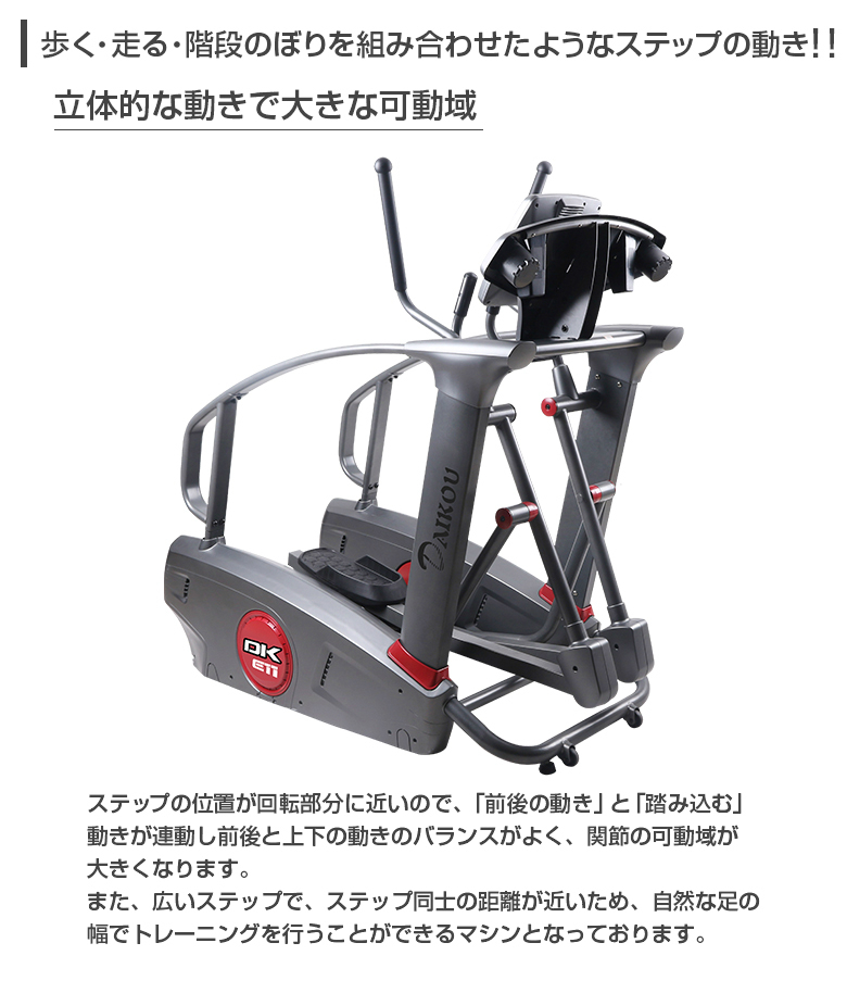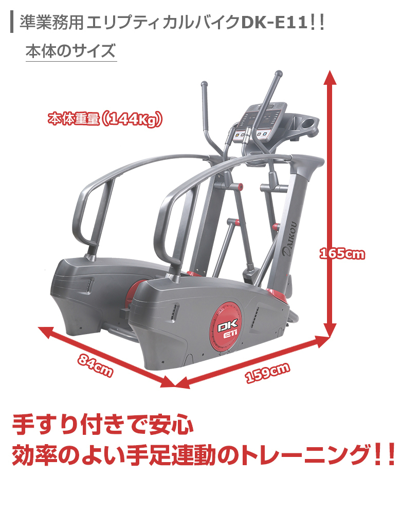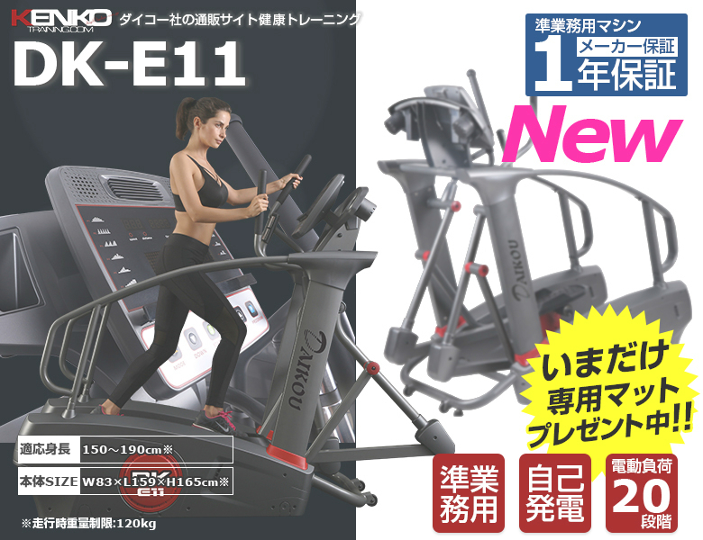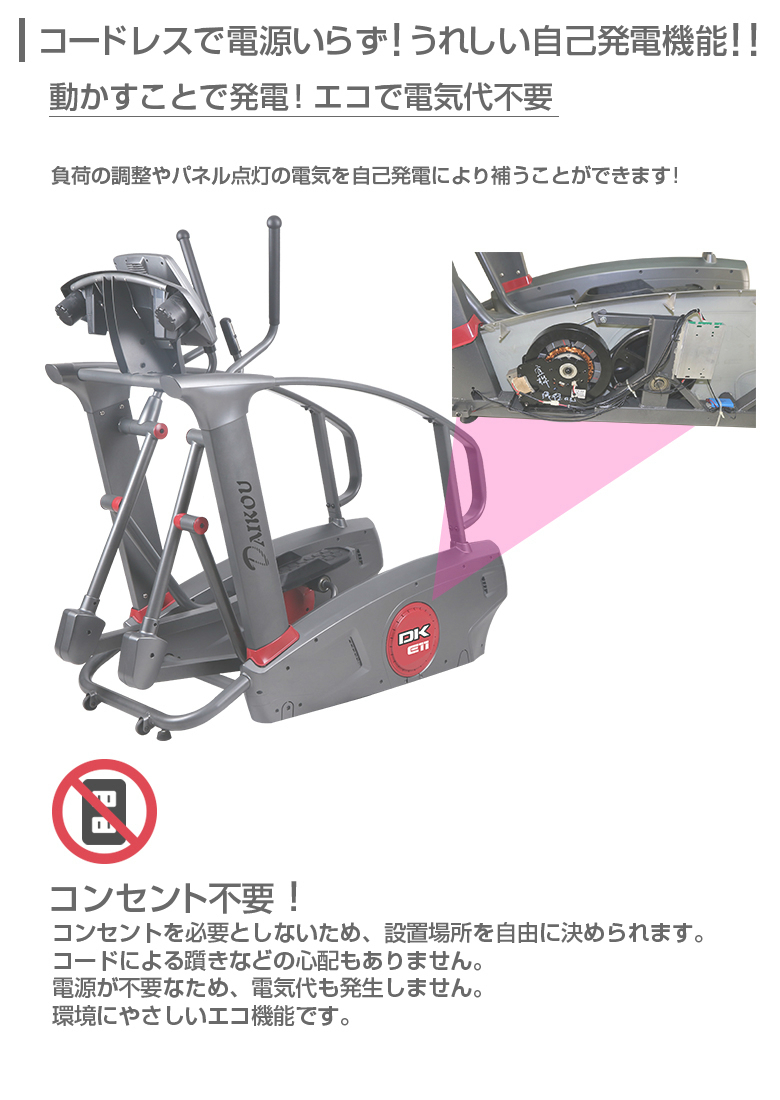 DK-E11は、フィットネスバイク開発メーカーであるダイコー社が販売保守する準業務用仕様の最新モデルです。自己発電による給電ですから、設置場所を選びません。全身運動に最も適したエリプティカル型のモデルです。